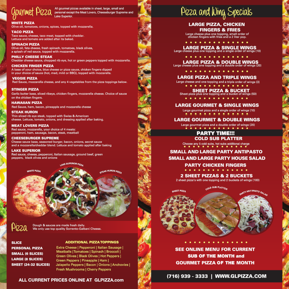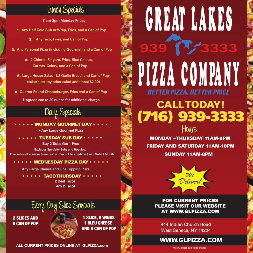 Looking for delicious comfort food? The Great Lakes Pizza Menu offers something for everyone, whether you're craving a classic pizza or something a bit more adventurous. From crispy, cheesy pizza topped with your favorite fresh ingredients to tasty pasta dishes, each meal is made with care. If you're in the mood for something lighter, they also serve flavorful salads and sandwiches, perfect for a quick bite. The menu even features some crowd-pleasing sides, like crispy chicken wings and garlic knots, to complement your meal. Whether you're dining in or ordering for delivery, you'll find a range of options to satisfy your hunger.